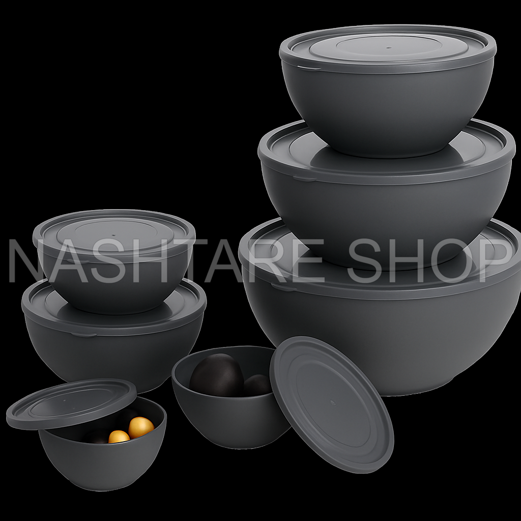 A 7-piece food prep bowl set with lids, perfect for mixing, storing, and organizing ingredients. Made of durable, food-safe plastic and available in soft modern colors. Ideal for any kitchen setup, these nesting bowls save space and keep food fresh.