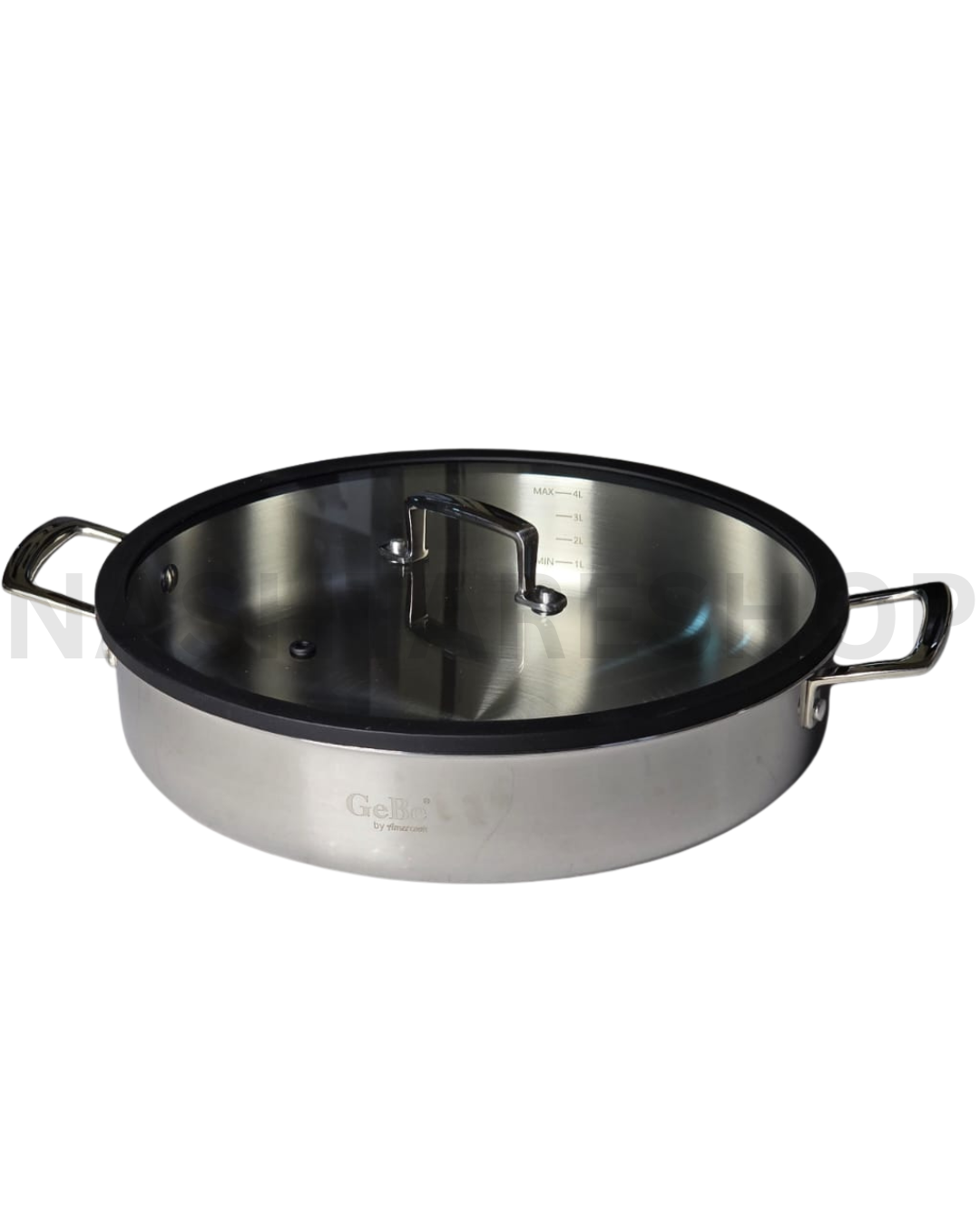 The GEBE 304 Stainless Steel Sauce Pan is a high-quality cookware piece designed for healthy, efficient, and professional cooking. Built with advanced 3-ply stainless steel construction, it delivers excellent heat distribution and long-lasting durability. The inner 304 textured stainless steel cooking surface enhances scratch resistance, while the aluminum core ensures even temperature control. Finished with a flat black silicone glass lid, this saucepan is ideal for everyday cooking on all hob types, including induction, and is oven safe for versatile use.