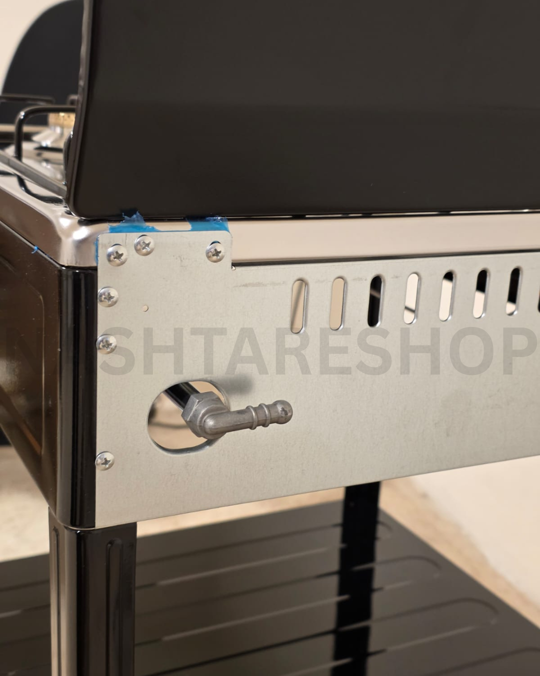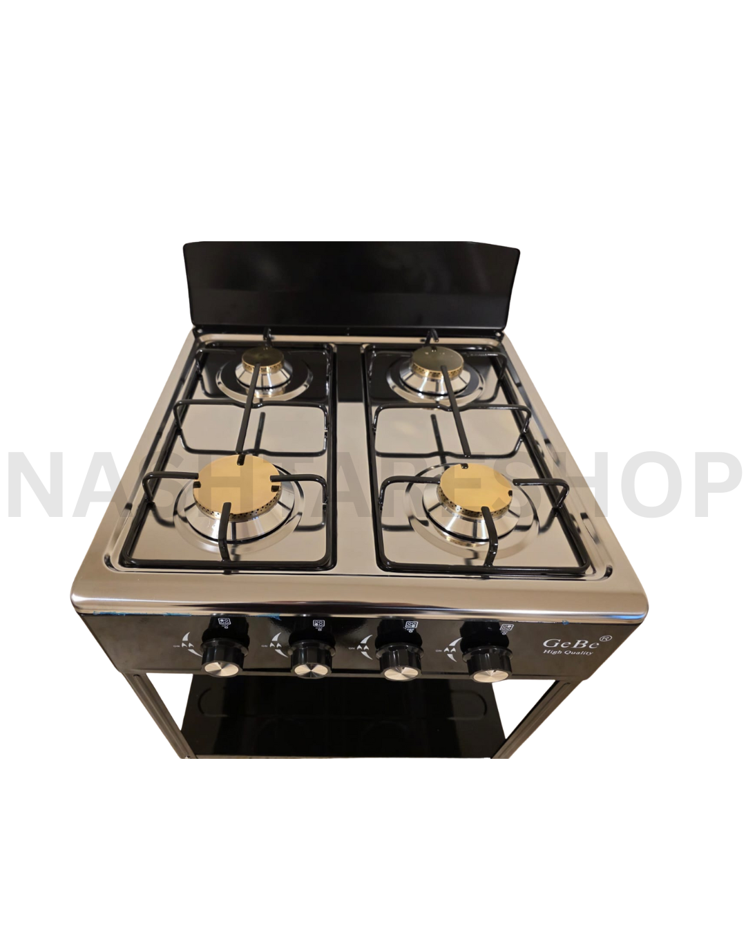 The Gebe 4-burner gas stove is a durable, spacious, and practical cooking unit designed for efficient daily use. It comes with a strong metal frame, two storage shelves, and plastic foot covers for stability. Ideal for home kitchens, balconies, and outdoor cooking.