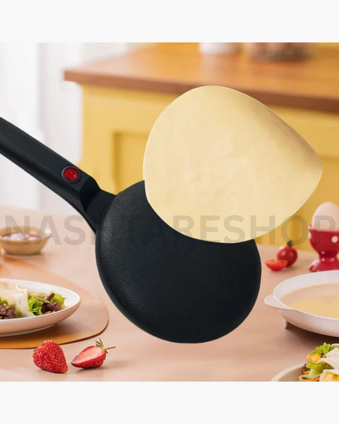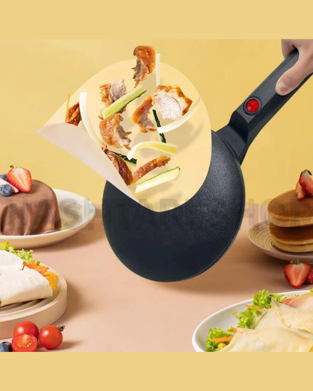 The Sinbo Electric Crepe Maker is designed to help you prepare perfectly thin, even pancakes and French crepes with ease. Lightweight and easy to use, it features a non-stick ceramic cooking plate that prevents sticking and allows for quick, mess-free cleaning. Simply dip the heated plate into the batter bowl, lift it, and within seconds your crepe is ready. The ceramic coating is safe for health and helps preserve vitamins and minerals for healthier cooking.