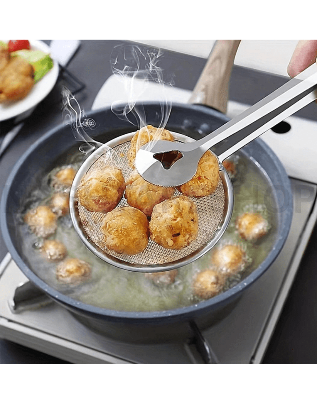 The Oil Filter Clip with Fine Mesh is a practical kitchen tool designed for safely lifting and draining fried foods while filtering excess oil. Made from high-quality stainless steel, it features a fine mesh strainer that helps remove oil efficiently, making your cooking cleaner and healthier. Perfect for frying, serving, and draining foods like fries, chicken, and snacks.